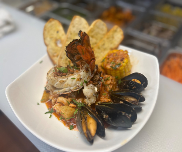 Grilled Canadian lobster tail, chunk shrimps, mussels, fish, lobster stock, fire roasted tomato sauce, vegetables, toast.