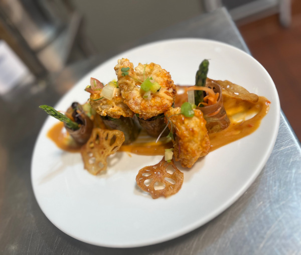 Breaded shrimps tossed in Cajun spice, spicy aioli, brown rice paper, Organic green, asparagus, peanut butter sauce...